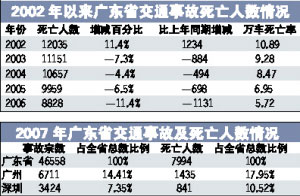 2007年,廣東省與廣州市地區(qū)均實(shí)現(xiàn)道路交通事故四項指數(shù)下降的目標(biāo)和特大交通事故大幅下降的目標(biāo),創(chuàng)造了道路交通事故死亡人數(shù)連續(xù)“五年連降”的成績,2007年更是首次沒有發(fā)生一次死亡10人以上的惡性交通事故。