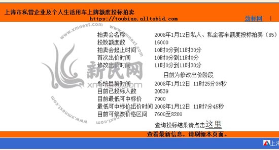 根據(jù)競標網(wǎng)友田小姐提供的數(shù)據(jù)顯示,10時開始,投標的網(wǎng)絡已人滿為患,投標電話爆滿, 10:15分參與競標人數(shù)僅有3523人。10:19分參與競標人數(shù)3745人;11時修改價格開始,投標人數(shù)已增長到25000余人, 11:25:36,最低可中標價為7900元,11:29:38,可最低中標價為8100元。