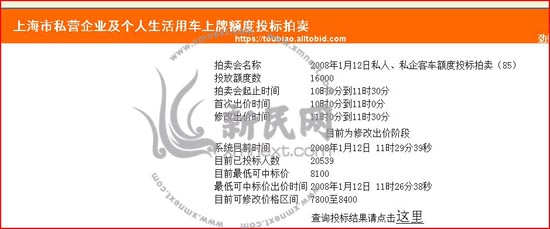 11時30分,本市2008年第一次私人、私營企業(yè)客車額度競標結(jié)束,新民網(wǎng)薛驍翔從現(xiàn)場發(fā)回最新消息稱,本次私車額度平均中標價為23370元,比上月減少32672元,下跌近60%;最低中標價為8100元,比上月足足跌了41900元,投標人共計20539人。