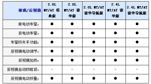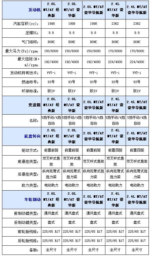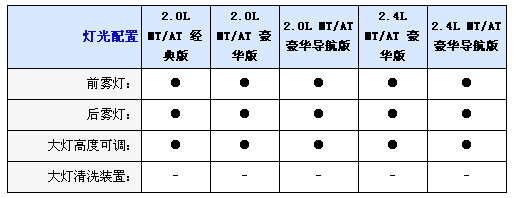 此次推出的10款新車全部配備鹵素前大燈并且?guī)в写鬅羰謩?dòng)高低調(diào)節(jié)功能,后尾燈標(biāo)配LED燈組并且配備高位剎車燈,2.4L車型將會(huì)使用鍍鉻格柵和2.0L車型前臉將會(huì)有一定的區(qū)別,另外入門級(jí)車型即經(jīng)典版車型不帶天窗;其它車型為標(biāo)配,2.4L所有車型標(biāo)配頂部行李架;但是2.0L車型則不會(huì)配備。