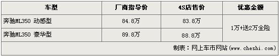 記者目前北京地區(qū)奔馳經(jīng)銷店了解到,現(xiàn)在購(gòu)買奔馳ML350動(dòng)感版和豪華型的消費(fèi)者都可享受現(xiàn)金1萬元的優(yōu)惠,并且購(gòu)車的消費(fèi)者還可獲得4S店贈(zèng)送的全車的保險(xiǎn),價(jià)值2萬元左右。銷售人員還介紹,目前4S店內(nèi)沒有奔馳ML現(xiàn)車供應(yīng),欲購(gòu)買車需等待一個(gè)月左右方可提車。