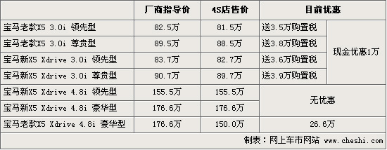 筆者從寶馬北京地區(qū)經(jīng)銷商處了解到,近日寶馬重磅推出了“四重購(gòu)車禮的”新春購(gòu)車促銷活動(dòng),其中有一項(xiàng)是送車輛購(gòu)置稅,針對(duì)車型包括X5在內(nèi)。據(jù)介紹,從2月1日到3月31日期間購(gòu)買X5的客戶可以贈(zèng)送50%的車輛購(gòu)置稅,其中包括了新老款共四款車型,但只針對(duì)3.0排量。新X5尊貴型3.0排量最高送近4萬元的購(gòu)置稅,購(gòu)車同時(shí)3.0排量還將有1萬元左右的現(xiàn)金優(yōu)惠。而目前老款X5豪華型1.8排量還有少量現(xiàn)車,當(dāng)前最高優(yōu)惠可達(dá)到26.6萬元。4S店內(nèi)有黑色和銀色的現(xiàn)車供應(yīng),消費(fèi)者可到店咨詢具體行情。
