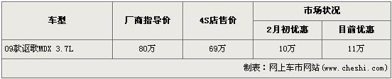 據(jù)謳歌經(jīng)銷商銷售人員介紹,謳歌08款MDX已經(jīng)停止進(jìn)口現(xiàn)車已賣完,以后也不會再引進(jìn)。目前在售的為謳歌09款MDX車型,09款謳歌-MDX的優(yōu)惠現(xiàn)已加大到11萬元,優(yōu)惠后售價也從原廠商售價80萬降到了69萬,跌破了70萬元。銷售人員還介紹,09款謳歌MDX增加的實(shí)用性的配件包括前下護(hù)板和后下護(hù)板,能避免惡劣路況對底盤帶來的損傷,并且09款謳歌MDX還新增了巴厘海藍(lán)和摩卡褐金兩種顏色,店內(nèi)現(xiàn)車非常充足,顏色也比較全,欲購買者挑選的空間非常大。