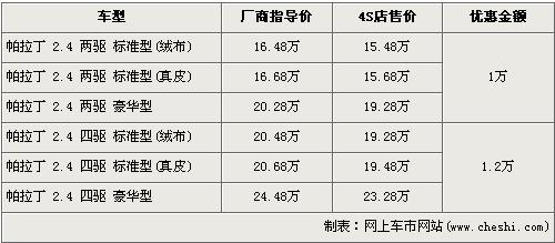 據(jù)4s店銷售人員介紹,帕拉丁兩驅(qū)車型的優(yōu)惠金額為1萬(wàn)元,四驅(qū)車型的優(yōu)惠金額為1.2萬(wàn)元。帕拉丁排量為2.4L,車系分為前置后驅(qū)和前置四驅(qū)兩種驅(qū)動(dòng)形式,每種驅(qū)動(dòng)形式中又分為標(biāo)準(zhǔn)版及豪華版,標(biāo)準(zhǔn)版分為絨布座椅或真皮座椅。絨布座椅全系最低配的帕拉丁 2.4兩驅(qū)標(biāo)準(zhǔn)版經(jīng)優(yōu)惠后售價(jià)降為15.48萬(wàn)元,而操縱性能更加穩(wěn)健,全系最高配的帕拉丁 2.4四驅(qū)豪華版經(jīng)優(yōu)惠后售價(jià)也降到了23.28萬(wàn)元。目前帕拉丁兩驅(qū)與四驅(qū)的豪華車型均無(wú)現(xiàn)車,欲購(gòu)買(mǎi)的消費(fèi)者需交訂金1萬(wàn)元,兩周后可提車。