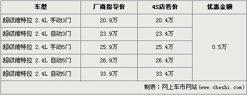 據(jù)4s店銷售人員介紹,目前店內(nèi)銷售的新超級(jí)維特拉全系優(yōu)惠5000元。低配的3門(mén)版2.4L 5速手動(dòng)車型最低售價(jià)降為20.4萬(wàn)元,而排量稍大采用5速自動(dòng)變速器的5門(mén)版3.2L車型經(jīng)優(yōu)惠后售價(jià)也降為33.4萬(wàn)元,是全系最高價(jià)。店內(nèi)現(xiàn)車顏色方面,新超級(jí)維特拉有黑、灰、白三個(gè)顏色供消費(fèi)者選購(gòu)。