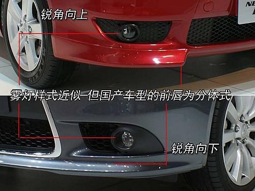 霧燈周邊的設(shè)計(jì)有所不同,塑料的燈罩邊緣的銳角設(shè)計(jì)位置兩車(chē)截然相反,但是霧燈的材質(zhì)以及照明方式未變。國(guó)產(chǎn)版藍(lán)瑟的前唇為分體樣式,進(jìn)口車(chē)為更完整化的一體樣式。