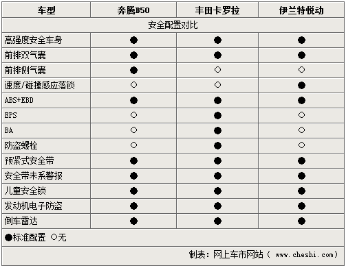 在安全裝備上,奔騰B50五款車(chē)型采用的是同樣的配置,前排雙氣囊、駕駛員自動(dòng)預(yù)緊安全帶、駕駛員安全帶未系報(bào)警等都為標(biāo)配,防炫目?jī)?nèi)后視鏡、后門(mén)兒童鎖、間歇式寬幅雨刷都為保障駕駛安全設(shè)計(jì)。對(duì)比另外兩款車(chē)型則少了EPS以及BA等輔助安全系統(tǒng)。