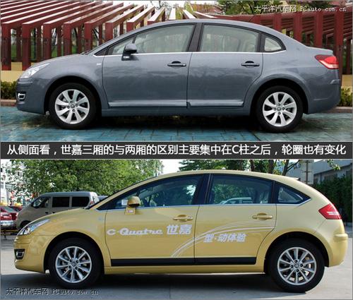 從車身數(shù)據(jù)表格對比我們不難發(fā)現(xiàn),世嘉三廂比兩廂車身長出274mm,車高多出3mm,軸距指標同樣為2610mm.從車身造型設計上看,B柱之前與世嘉兩廂幾乎一模一樣,簡潔中透出一股運動感,而且在細節(jié)上也不吝惜功夫,比如一直以來為人稱道的車燈,雪鐵龍齒輪標等,都非常精美。