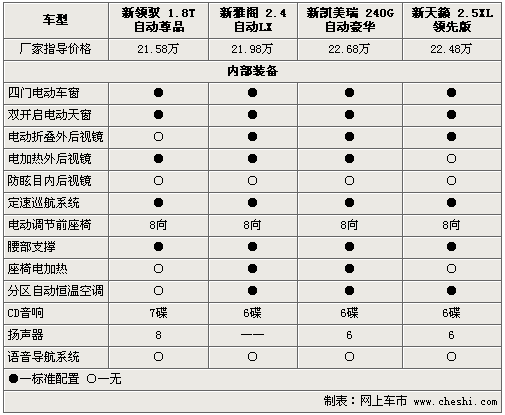 在內(nèi)部裝備方面,四款中級車更是不遺余力的配備各自高端配置,電動天窗、定速巡航、電動座椅、以及自動空調(diào)均稱為四款車的標(biāo)準(zhǔn)配置。但新雅閣、新凱美瑞和新天籟配備的電動折疊外后視鏡,卻沒有出現(xiàn)在新領(lǐng)馭同級車上。此外,新領(lǐng)馭配備的7碟CD和8揚聲器音響系統(tǒng),似乎較其它三款日系車更加悅耳。