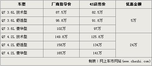 據(jù)經(jīng)銷商銷售人員介紹,奧迪Q7分為3.6L和4.2L兩種排量共7款車型,目前全系最高優(yōu)惠為25萬元現(xiàn)金。3.6L車型優(yōu)惠5萬元,優(yōu)惠后售價分別為:技術(shù)型82.5萬元,舒適型91.8萬元,豪華型97萬。排量更大的4.2L車型優(yōu)惠更是達到了24萬元,優(yōu)惠后售價分別為技術(shù)型125.8萬元,舒適型134萬元,豪華型141萬元。