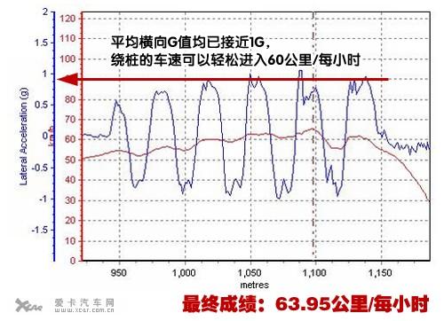 從曲線圖中我們可以看出,邁騰的平均橫向G值均已接近1G,繞樁的車速可以輕松進(jìn)入60公里/每小時,而最終63.95公里/每小時的18米繞樁成績,再次展現(xiàn)出大眾PQ46平臺的強(qiáng)大實(shí)力。