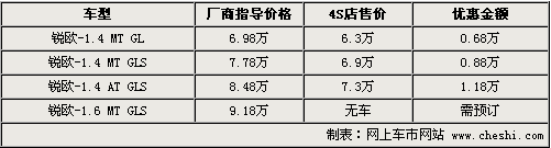 據(jù)4S店銷售人員介紹,目前銳歐全系優(yōu)惠幅度并不大,現(xiàn)售主要是1.4L排量車型,由于賽拉圖兩廂和三廂完全能夠滿足消費者的購車需要,所以幾乎沒有消費者選購1.6L排量的銳歐。1.4L三款車優(yōu)惠價格從0.68萬元到1.18萬元不等,同時店內(nèi)有銀色、紅色等現(xiàn)車可供選購,現(xiàn)車顏色較為齊全,消費者選擇的空間比較大。