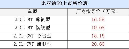 2009年7月19日,比亞迪旗下首款雙門硬頂跑車S8正式上市。新車共推出2.0L排量的四款車型,售價(jià)16.58-20.68萬(wàn)元。此次為S8在深圳的首站上市,隨后S8還將陸續(xù)在國(guó)內(nèi)多個(gè)城市上市。新車詳細(xì)售價(jià)請(qǐng)見(jiàn)下表: