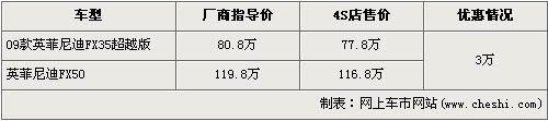 據(jù)英菲尼迪4s店銷售人員介紹,目前店內(nèi)銷售的FX系列有FX50和09款FX35兩款車型,并且近期都有3萬元的優(yōu)惠。經(jīng)優(yōu)惠后,英菲尼迪FX50售價(jià)從119.8萬元降到了116.8萬元。09新款的FX35超越版售價(jià)也降到了77.8萬元。