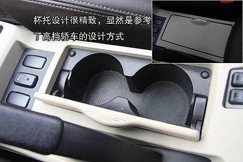 杯托的制造工藝借鑒了高檔轎車杯托的設(shè)計,一個可以折疊的杯托蓋改善了視覺效果。