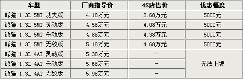 據(jù)吉利汽車4S店銷售人員介紹,熊貓1.3L手動擋車型目前都有現(xiàn)車銷售,而自動擋雖然已經(jīng)上市,但由于北京地區(qū)無法上牌,所以還沒有現(xiàn)車抵達北京市場,預(yù)計最早會在今年8月份解決無法上牌的問題。目前熊貓1.3L手動擋全系可以優(yōu)惠五千元,而這款車型還增加了電動升級后窗,需要在原價的基礎(chǔ)上加1000元。
