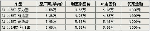 上個月中旬,奇瑞09款A1宣布在現(xiàn)有車型的基礎上增加了實力型和AMT兩種新車型,同時舒適型和豪華型官方降價4000元,售價已進入五萬元以內。網站近日了解到,各家4S店內的新車價格有所變化,全系車型均可小幅優(yōu)惠1000元。詳情如下:
