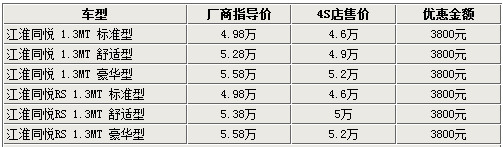 江淮的同悅及同悅RS系列車型,自上市后就吸引了眾多消費者關(guān)注。在三廂車型銷售很長時間之后,兩廂的RS版終于進入了北京市場開始銷售。網(wǎng)站由江淮轎車經(jīng)銷商處了解到,現(xiàn)在RS版以及三廂同悅車型店內(nèi)現(xiàn)車充足,購車最高可有3800元的現(xiàn)金優(yōu)惠。具體詳情如下: