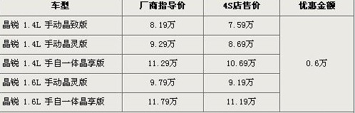 據(jù)4S店銷售人員介紹:目前晶銳全系優(yōu)惠6000元,最低僅售7.59萬。晶銳目前現(xiàn)車較為充足,顏色比較齊全,個(gè)別車型無現(xiàn)車。如需要預(yù)訂車輛,最短需等1個(gè)半月,最長(zhǎng)需等2個(gè)月時(shí)間。價(jià)格方面,如到店內(nèi)洽談可獲得更高優(yōu)惠。為了慶祝“國(guó)慶六十周年”,在店內(nèi)購(gòu)車可選擇送購(gòu)置稅或送保險(xiǎn)加精品裝飾或直接優(yōu)惠現(xiàn)金,選擇余地較多,消費(fèi)者可根據(jù)自身實(shí)際情況購(gòu)車。