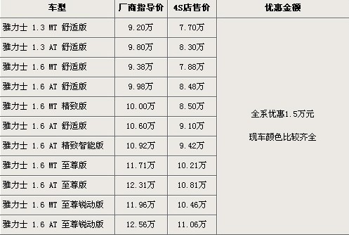 據(jù)廣汽豐田北京地區(qū)4S店銷售人員介紹,現(xiàn)在購買雅力士車型全系優(yōu)惠現(xiàn)金1.5萬元。目前雅力士1.3排量和1.6排量均有現(xiàn)車供應,現(xiàn)車顏色以黑色、紫色、銀色為主。北京地區(qū)各4S店由于訂單不同,各店銷售的現(xiàn)車顏色有所不同。