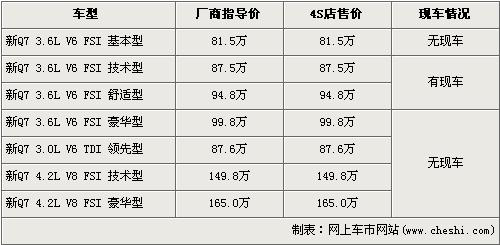 據(jù)北京奧迪4S店銷售人員介紹,新款的奧迪Q7有三個(gè)排量共7款車型,售價(jià)區(qū)間為81.5萬元-165萬元。目前店內(nèi)已經(jīng)到第一批先期預(yù)訂的奧迪新Q7現(xiàn)車,車型為3.6L技術(shù)型和3.6L舒適型。現(xiàn)在欲購買新Q7的消費(fèi)者需交1萬元訂金,下個(gè)月中旬方可提車。