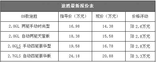 09款途勝上市后銷量一直都不錯,8月份售出了4331輛,在國內(nèi)SUV銷量榜中排在第五位,比同價位競爭對手獅跑和逍客高出不少。昨日,我們從北京地區(qū)的一家北京現(xiàn)代汽車綜合經(jīng)銷商處了解到,近期09款途勝的價格已經(jīng)趨于穩(wěn)定,最高可優(yōu)惠3.3萬元。以下是09款途勝最新報價表: