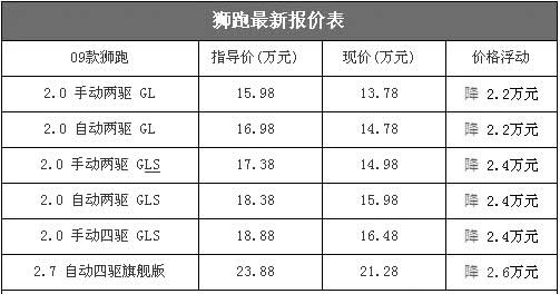 09款獅跑上市后,價格迅速下降,因此月銷量能夠穩(wěn)定在4000輛左右。我們昨日從北京地區(qū)一家東風(fēng)悅達(dá)起亞獅跑經(jīng)銷商處了解到,近期獅跑部分車型的優(yōu)惠再次增加2000元,最高降幅已經(jīng)增至2.4萬元,性價比再次提升。目前獅跑最低配車型2.0手動兩驅(qū)舒適版的售價為13.78萬元,和歷史最低價持平,和競爭對手途勝售價非常接近。以下是09款獅跑最新詳細(xì)報價表: