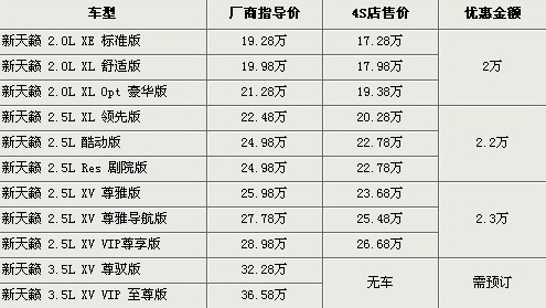 據(jù)東風日產經銷店銷售人員介紹,目前新天籟(報價 參數(shù) 圖片 論壇)2.0舒適版和2.5領先版等比較受歡迎的車型有現(xiàn)車供應,主要為銀色/灰色等外觀。其他尊雅版車型需要預訂。目前的優(yōu)惠幅度為2萬元-2.3萬元不等,入門車型優(yōu)惠后僅售17.28萬元,對消費者而言性價比比較強。