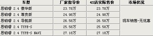 據(jù)東風(fēng)本田4S店銷售人員介紹,目前思鉑睿全系車型均以到店,但車型顏色比較單一。思鉑睿全系提供了塔夫綢白、彩晶黑、鈦金銀、炫影藍(lán)、炫動(dòng)紫五種外觀顏色,以及靜雅黃、靜逸黑兩種內(nèi)飾顏色供消費(fèi)者選擇。TYPE-S車型還推出炫速紅專用色。售后保養(yǎng)方面制定整車三年十萬公里的保修政策,提供3個(gè)月/5000公里的易損件保修服務(wù)。