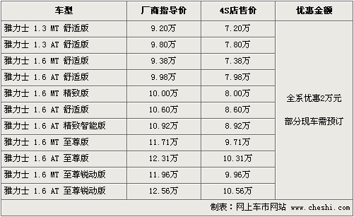 據(jù)廣汽豐田北京地區(qū)4S店銷售人員介紹,現(xiàn)在購買雅力士車型全系優(yōu)惠現(xiàn)金2萬元。目前雅力士1.3車型和1.6舒適、精致均有現(xiàn)車供應(yīng),至尊及銳動版現(xiàn)車數(shù)量較少,部分車型需預(yù)訂。現(xiàn)車顏色以黑色、紫色、銀色為主。如消費(fèi)者有意購買,到店詳談會有更優(yōu)惠的價(jià)格。北京地區(qū)各4S店由于訂單不同,各店銷售的現(xiàn)車顏色有所不同。