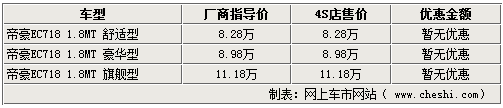 據(jù)北京地區(qū)帝豪4S店銷售人員介紹,帝豪EC718共有三款車型,售價8.28萬元起。目前店內(nèi)車型顏色不是很全,消費者可以到店看車、購買;暫時沒有的顏色可預訂,訂金3000元,預計交車時間大概在一個月左右。全系車型因是新車,所以暫時沒有現(xiàn)金優(yōu)惠或贈品,還請消費者諒解。