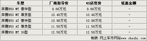 作為一汽奔騰全新家用轎車,與馬自達(dá)6同一平臺的奔騰B50,搭載速騰1.6L引擎。推出市場以后,奔騰B50憑借優(yōu)秀的外形設(shè)計(jì)和過硬的品質(zhì),受到很多消費(fèi)者的喜愛。網(wǎng)上車市網(wǎng)站了解到,北京各家經(jīng)銷商處奔騰B50現(xiàn)車顏色不全,購車仍無任何優(yōu)惠。詳情如下: