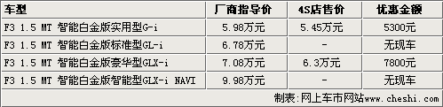 據(jù)比亞迪汽車4S店銷售人員介紹,目前比亞迪F3智能白金版只有實用型和豪華型有現(xiàn)車銷售,智能型和標準型都現(xiàn)車不足,F(xiàn)在購買比亞迪F3智能白金版可以有較大的優(yōu)惠幅度,其中實用型可以優(yōu)惠5300元;豪華型也可優(yōu)惠7800元。該比亞迪4S店銷售人員表示,如果到店詳談,還可以有更多的優(yōu)惠幅度。