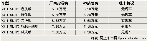 據(jù)東南汽車4S店銷售人員介紹,目前V3菱悅現(xiàn)車比較少,只有豪華版和旗艦升級版有現(xiàn)車銷售,風采版少量現(xiàn)車會在近期到店。而其他車型目前只能接受預(yù)訂,預(yù)計半個月左右能夠提到現(xiàn)車。目前購買V3菱悅沒有任何優(yōu)惠政策,而且并不贈送裝飾。