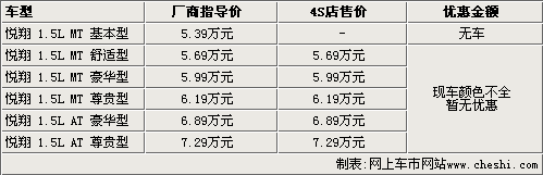 據(jù)長安汽車4S店銷售人員介紹,悅翔目前只有五款車型有現(xiàn)車銷售,其中包括三款手動檔車型和兩款自動檔車型。售價5.39萬元的悅翔手動基本型一直就沒有現(xiàn)車銷售,屬于有價無車的狀態(tài)。其他車型雖然有現(xiàn)車,但個別顏色仍需要預訂。長安汽車4S店銷售人員表示,目前購買悅翔并沒有任何優(yōu)惠政策。