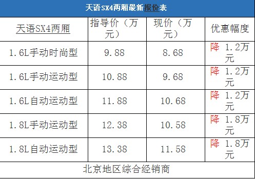 近日,編輯從北京地區(qū)長安鈴木綜合經(jīng)銷商處了解到,天語SX4兩廂有黑色和紅色現(xiàn)車,目前購車最高有1.8萬元的現(xiàn)金優(yōu)惠,并且贈送汽車裝飾,性價比非常不錯。據(jù)經(jīng)銷商透露,消費(fèi)者想要以這個價格提車,需要在店內(nèi)做一條龍服務(wù),其中車輛四項(xiàng)基本保險可以打8.5折(約合3500-4100元左右)。以下是天語SX4最新價格變化表: