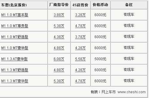 瑞麒品牌所推出的首款車型瑞麒M1,在上市之后,根據(jù)國內(nèi)消費(fèi)者的需求,瑞麒M1在推出1.0和1.3L兩款手動檔車型后,又推出了1.3L自動檔車型,豐富產(chǎn)品線的同時給消費(fèi)者更多的選擇余地。近期,網(wǎng)上車市走訪了北京地區(qū)瑞麒4S店,對瑞麒M1最新的市場情況進(jìn)行了了解,發(fā)現(xiàn)目前瑞麒M1車型全系降價又有了新高度。