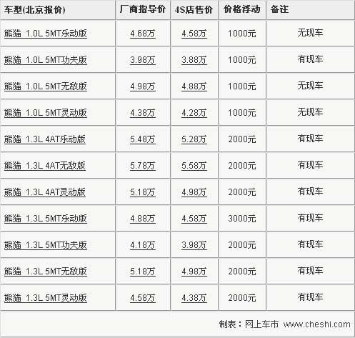 作為全球鷹旗下首款產(chǎn)品,吉利熊貓自上市以來就廣受年輕消費(fèi)者的關(guān)注。很多消費(fèi)者不難看出,吉利熊貓時(shí)尚靚麗的外形,與憨態(tài)可掬的熊貓非常相似,給整車帶來很多可愛的元素,符合時(shí)下年輕消費(fèi)者的購車需求。網(wǎng)上車市近期走訪北京地區(qū)吉利4S店,了解到了吉利熊貓最新的市場(chǎng)信息,具體情況請(qǐng)參考下表: