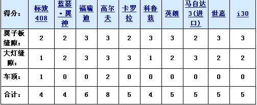 2、發(fā)動機蓋與大燈的接縫。十款車相比的話,縫隙較小的3分;有些車縫隙中有密封條,視為縫隙較;縫隙一般大的得2分,縫隙較大的得1分。