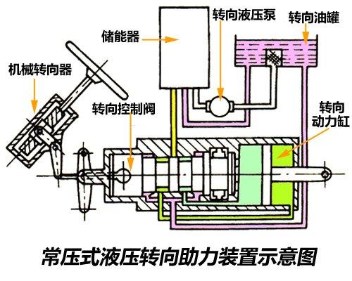 機(jī)械液壓助力系統(tǒng)的主要組成部分有液壓泵、油管、壓力流體控制閥、V型傳動(dòng)皮帶、儲(chǔ)油罐等等。這種助力方式是將一部分發(fā)動(dòng)機(jī)動(dòng)力輸出轉(zhuǎn)化成液壓泵壓力,對(duì)轉(zhuǎn)向系統(tǒng)施加輔助作用力,從而使輪胎轉(zhuǎn)向。