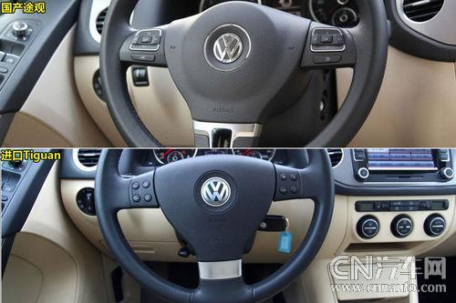 內(nèi)飾及細(xì)節(jié)差異:國(guó)產(chǎn)車型在一些細(xì)節(jié)設(shè)計(jì)上要更具優(yōu)勢(shì),比如方向盤采用了高爾夫6式的新風(fēng)格,方向盤輻條和多功能按鍵在金屬鍍鉻的裝飾下,明顯更具質(zhì)感。此外,包括大燈調(diào)節(jié)旋鈕、電動(dòng)車窗按鈕都增加了金屬風(fēng)格的裝飾。雙區(qū)自動(dòng)恒溫空調(diào)也啟用了和斯柯達(dá)昊銳相同款式的最新設(shè)計(jì)面板。而在一些并不是十分重要的配置上,國(guó)產(chǎn)車型省略后以進(jìn)一步降低價(jià)格,比如音響面板上方的副駕駛席氣囊指示燈變成了卡片槽,手套箱中的副氣囊開關(guān)也沒有再出現(xiàn)。國(guó)產(chǎn)車型由于兩種排量多達(dá)8款車型配置,導(dǎo)航系統(tǒng)、全景天窗都可以選裝配置也讓消費(fèi)者多了更多選擇。尤其是對(duì)于低端消費(fèi)者,國(guó)產(chǎn)途觀還是具備相當(dāng)?shù)奈Α?/p>