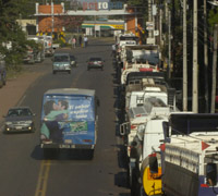 國(guó)際油價(jià)的大幅上漲使得石油嚴(yán)重依賴進(jìn)口的巴拉圭面臨嚴(yán)重的能源危機(jī),巴拉圭石油公司(Petropar)至今仍拖欠外國(guó)石油公司3.2億美元的費(fèi)用,國(guó)內(nèi)成品油供應(yīng)嚴(yán)重不足。近30%的公交車(chē)和出租車(chē)因?yàn)槿庇蜔o(wú)法工作,正在收割季節(jié)的農(nóng)業(yè)部門(mén)也因?yàn)槿加凸⿷?yīng)不足蒙受巨大損失。圖為7月15日,巴拉圭首都各加油站的運(yùn)油車(chē)在巴拉圭石油公司大門(mén)前排起長(zhǎng)隊(duì),等待加油。