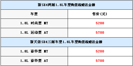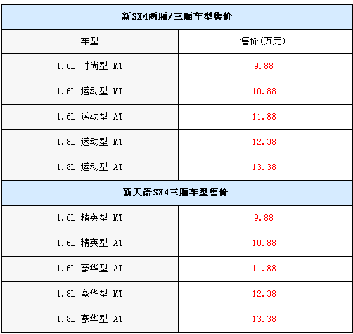 2009年3月10日,長(zhǎng)安鈴木新款SX4車型上市。此次上市的新車共有1.6L和1.8L兩個(gè)排量,其中1.8L為新增車型。新款SX4兩廂/三廂車型各推出5款車型,共計(jì)10款,售價(jià)區(qū)間為9.88~13.38萬(wàn)元。同時(shí),長(zhǎng)安鈴木宣布,購(gòu)買新增天語(yǔ)SX4 1.8L車型將獲贈(zèng)50%的購(gòu)置稅補(bǔ)貼,享受與 1.6L車型同等的購(gòu)置稅優(yōu)惠,讓購(gòu)車者得到更多的實(shí)惠。具體車型售價(jià)如下: