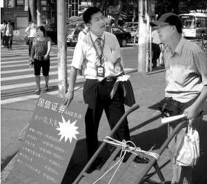 男子胳膊上挎著一個紅色拎包,里面裝滿資料和表格,他手拿一份資料,逢人便攔,以這些價格不菲的禮品誘惑他們停下腳步,聽他把開戶炒股的好處一一道來。心動的路人不多,無奈之下,他連手推兩輪車忙著送貨的人也不錯過。昨天,記者從國信證券了解到,由于市場表現(xiàn)不好,的確有很多業(yè)務員上街送禮促銷,至于送禮價值大小,則由業(yè)務員自行決定,公司的統(tǒng)一政策是,免除新開戶兩市總計90元的開戶費。