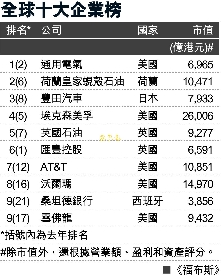據(jù)香港《文匯報(bào)》消息,《福布斯》根據(jù)綜合評(píng)分定出是項(xiàng)排名,營(yíng)業(yè)額、盈利、資產(chǎn)和市值占同等比重。三甲位置分別由美國(guó)通用電氣、荷蘭皇家蜆殼石油和日本豐田汽車(chē)奪得,十大位置中,美國(guó)占了5席。