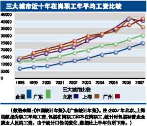 在廣東省內(nèi)6個(gè)主要城市之間,2007年廣州在崗職工年平均工資以40562元位居榜首,深圳在崗職工年平均工資以38798元緊隨其后,緊接著是東莞35284元,佛山28330元,中山27879元,珠海26616元。在廣州與深圳的比較中,2004年是“分水嶺”,在此之前,深圳的在崗職工年平均工資高于廣州,2005年開始廣州超越深圳。