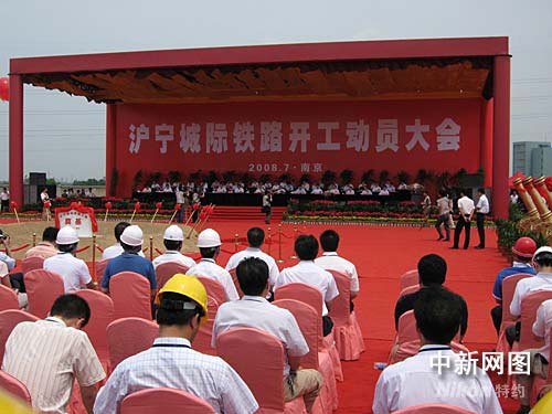 今天的動員大會上,中共上海市市委書記俞正聲,鐵道部部長劉志軍、江蘇省委書記梁保華、省長羅志軍等官員出席,為滬寧城際鐵路開工鏟土奠基。