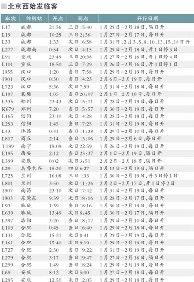 節(jié)后加開的55趟臨客中,北京西站有35趟,北京站有16趟,北京北站有4趟。這些臨客中開往合肥方向的臨客有7趟,哈爾濱方向的臨客有5趟(包括動車組D29、Z115、T71)。以上臨客最早的從大年初一開行,最晚的要到2月19日。旅客可參考車站公告了解具體開行情況。