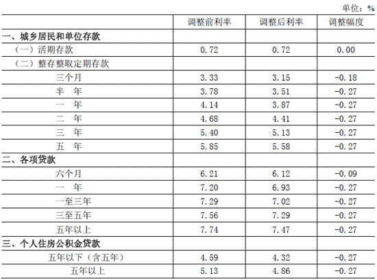 金融機(jī)構(gòu)人民幣存貸款基準(zhǔn)利率調(diào)整表