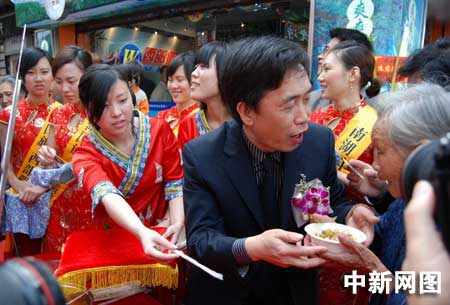 中新網(wǎng)廣州4月7日電 (記者 莫非 通訊員 林月明)大方漆器、布依地毯、蠟染、玉屏簫笛等讓人眼花繚亂,貴陽的氣息撲面而來。廣東首家“貴陽形象店”7日在南湖國旅·西部假期位于廣州上下九步行街的營業(yè)點落戶。在開業(yè)現(xiàn)場,貴陽旅游局副局長方隨洪更是走上街頭,請老廣品嘗正宗美味的酸湯魚,同時還將香囊等貴陽的小特產(chǎn)親手贈送給市民,邀請老廣齊赴貴陽旅游。